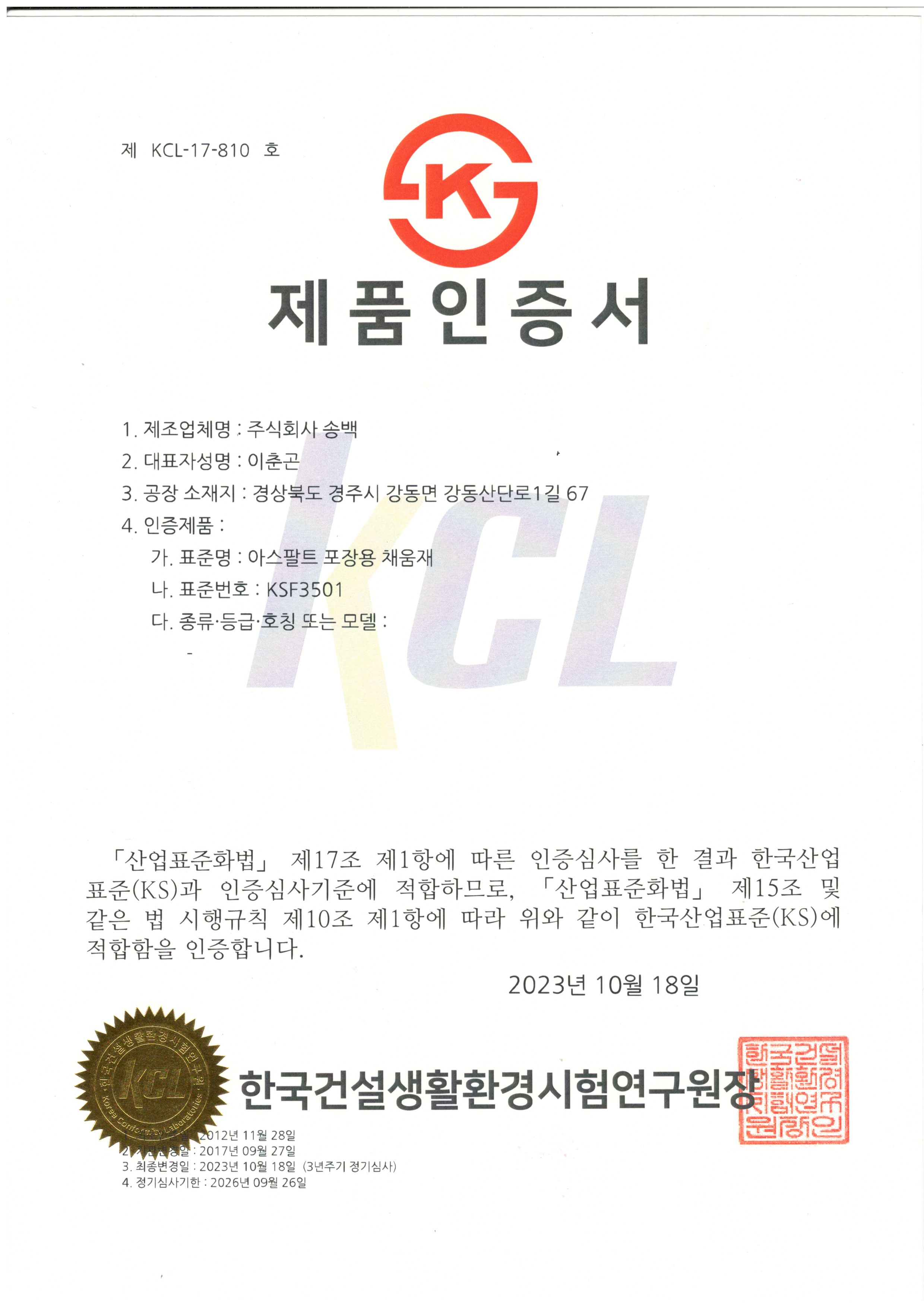 제품인증서(KS F 3501)